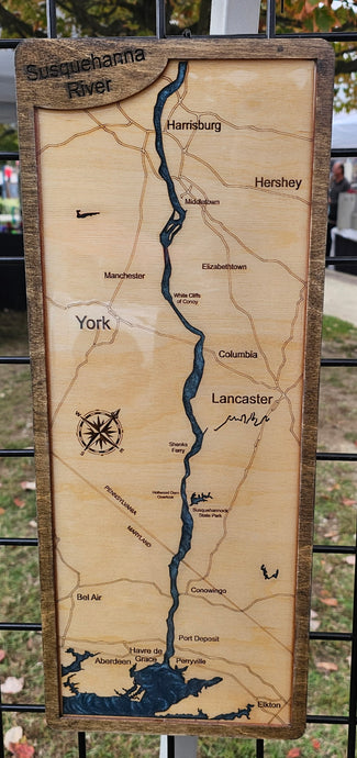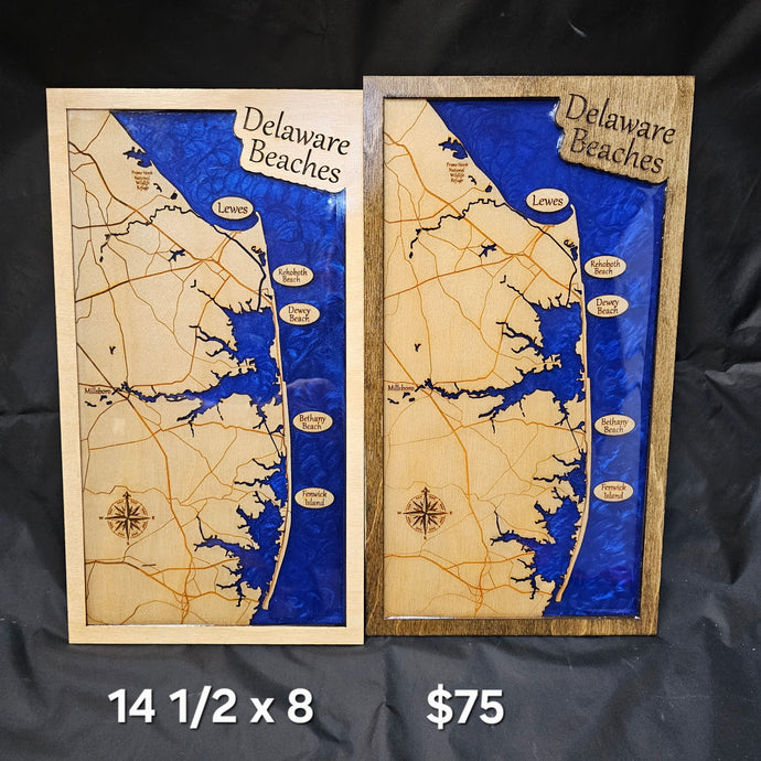 A client requested maple wood flight board to represent their state (in the shape of Delaware). Any state can be burned into a board with custom horizontal banner colors or bare board to be 100% covered in food safe epoxy, with clear tube shaped handles.