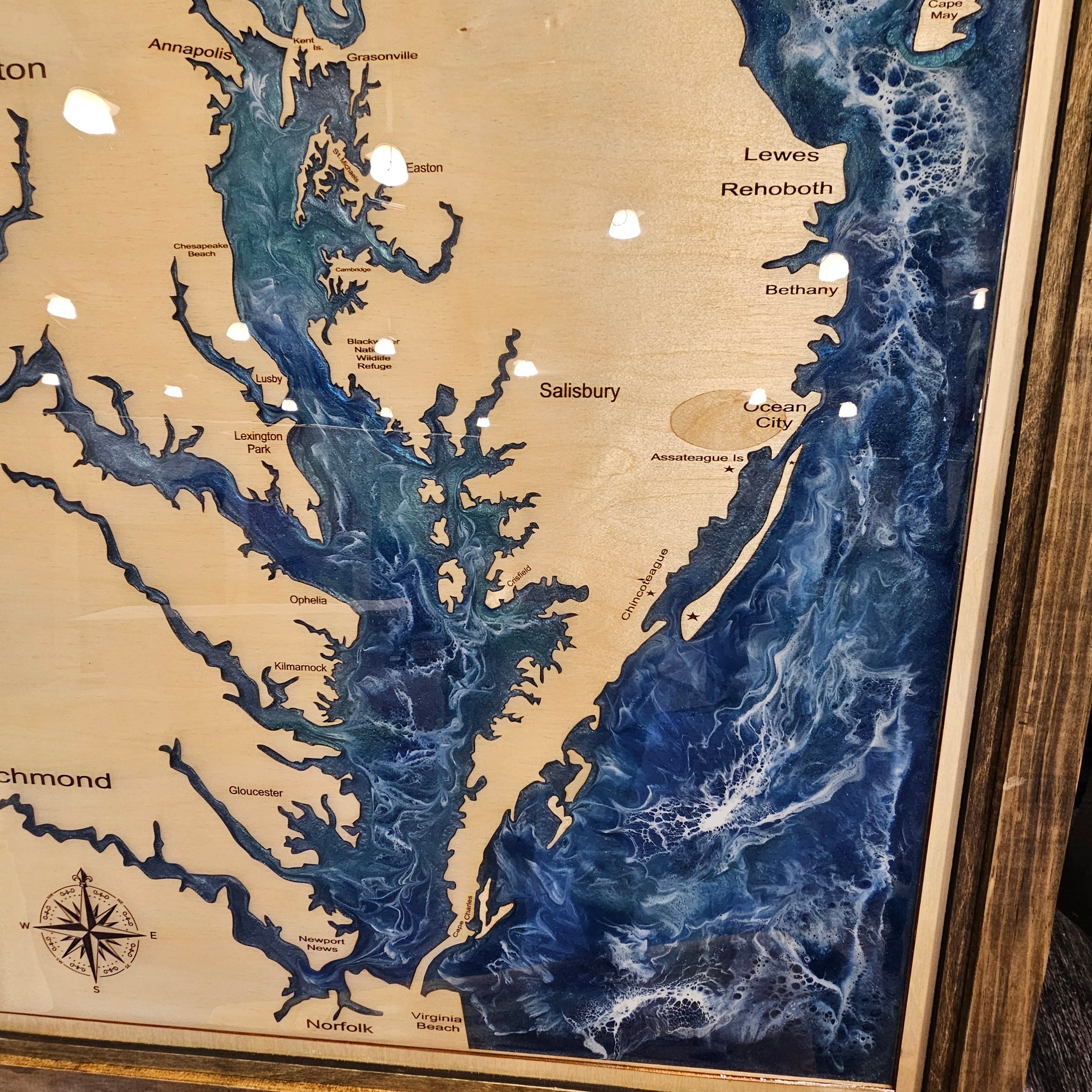 This impressive map is 29 1/2" x 37" with multiple epoxy layers to create depth and movement.
